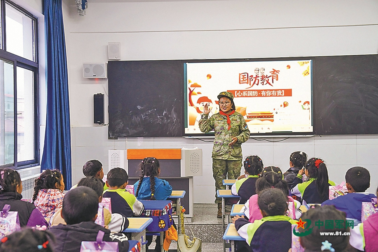 “雪域春蕾”工作队成员在西藏山南市洛扎县拉郊乡蓝天春蕾小学讲授国防教育课程。廖继龙摄